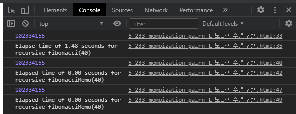console.log(`Elapsed time of ${((end-start)/1000).toFixed(2)} seconds for recursive fibonacciMemo(${testNum}) for the first time`);